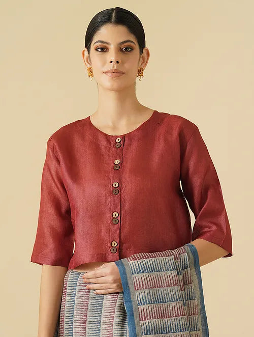 This blouse is a silkmark certified pure tussar blouse. The cut is contemporary and suits most women's body types. The fit is an easy fit and is perfect for an outing day or evening.