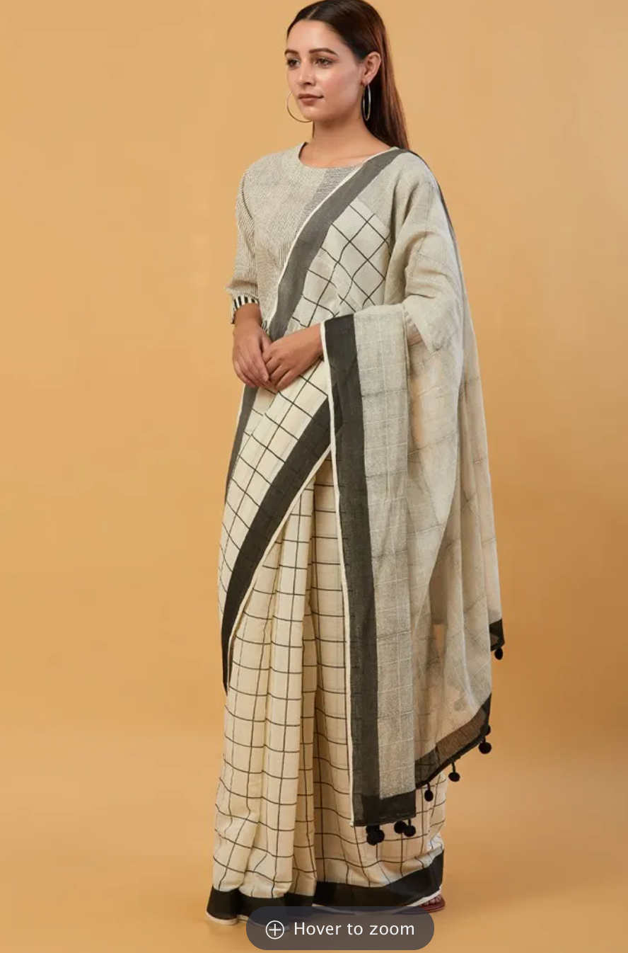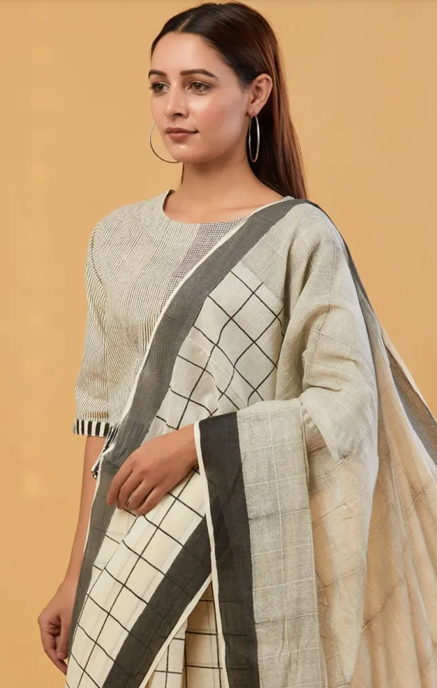 This is a black and white striped handd-block Printed Blouse with wooden buttons can be teamed beautifully with any saree.