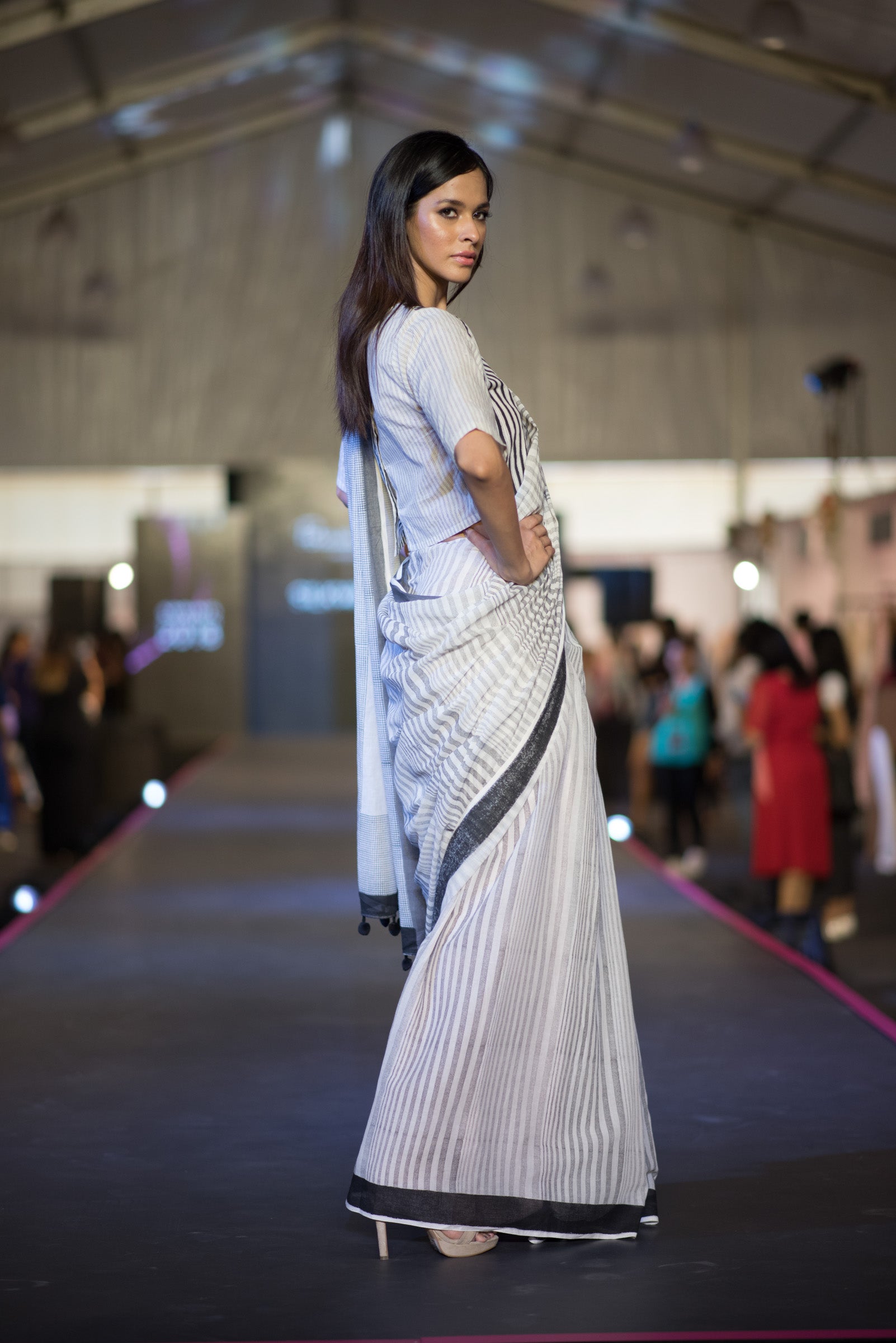 This is a black and white striped handd-block Printed Blouse with wooden buttons can be teamed beautifully with any saree.